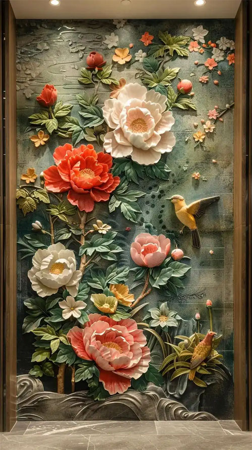 牡丹花浮雕背景墙_合肥牡丹花浮雕画